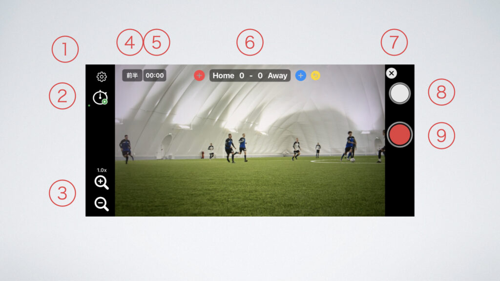 | ⑤ | 試合タイマー(表示&リセット) | ・表示部分をタップすると、タイマーをリセットできるダイアログが表示されます ・録画を一時停止しても、試合タイマーは止まりません |