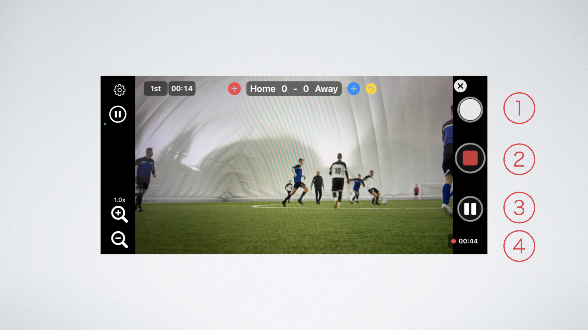 | ③ | 一時停止/再開ボタン | 撮影の一時停止・再開用のボタンです 一時停止前と再開後の動画は一つのファイルとして保存されます 💡 Tip: 一時停止の間も試合タイマーは動作し続けます |